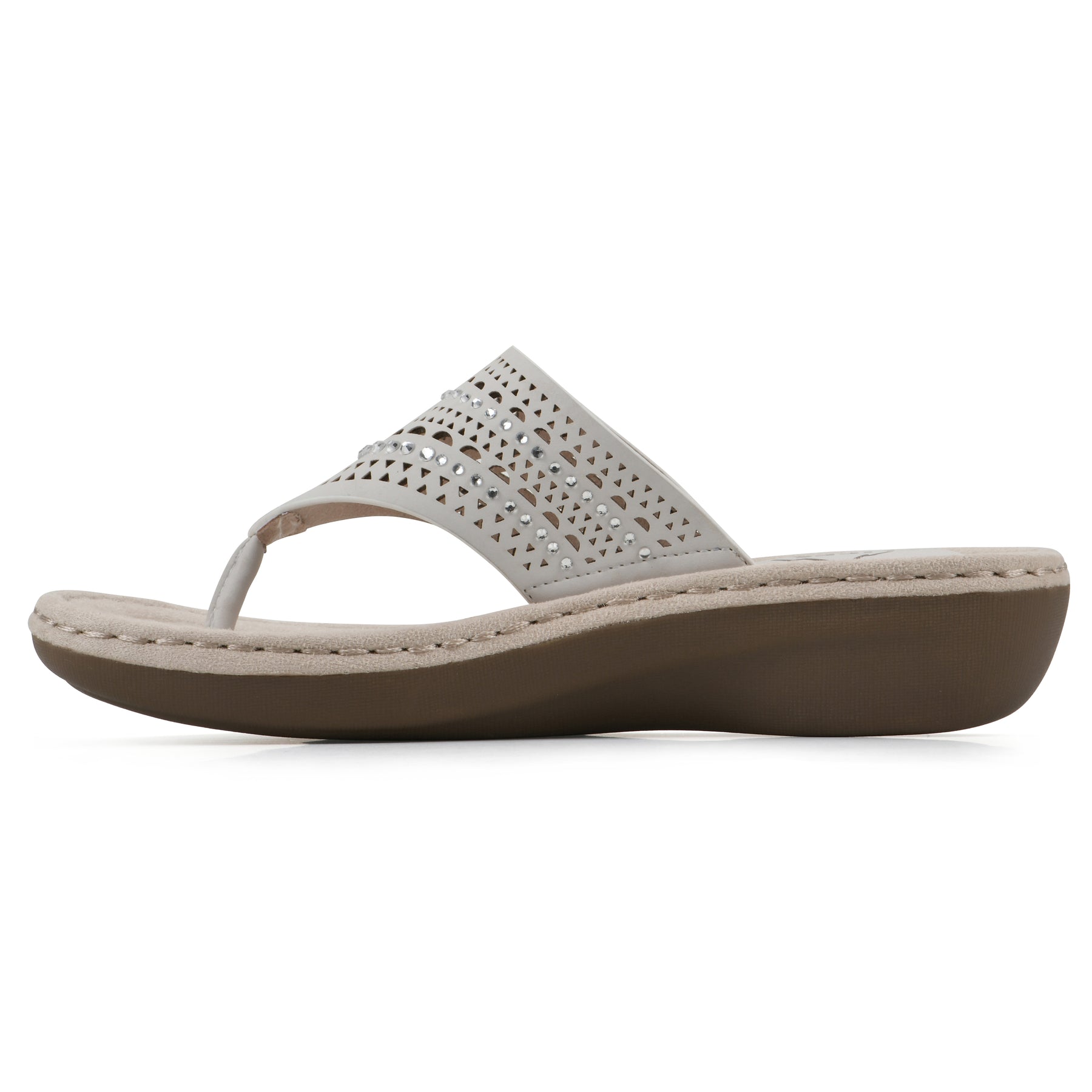 The Comate wedge from Cliffs by White Mountain Shoes features dainty rhinestone embellishments and a perforated design for functional breathability. These wedge sandals add a touch of glamour to your warm-weather wardrobe with their chic thong design and sleek wedge heel. Complete with a padded insole to keep you comfortable, whether you're strolling on the beach or stepping out for a casual evening, the Comate slip-on will keep you looking stylish and feeling fabulous.