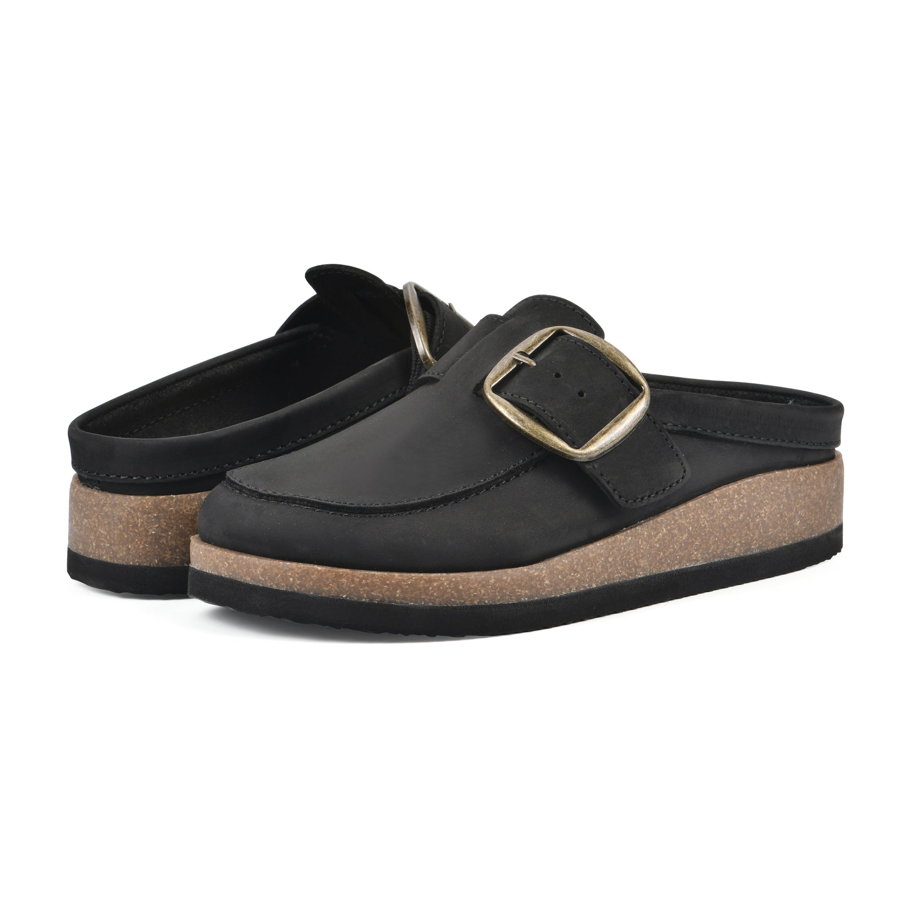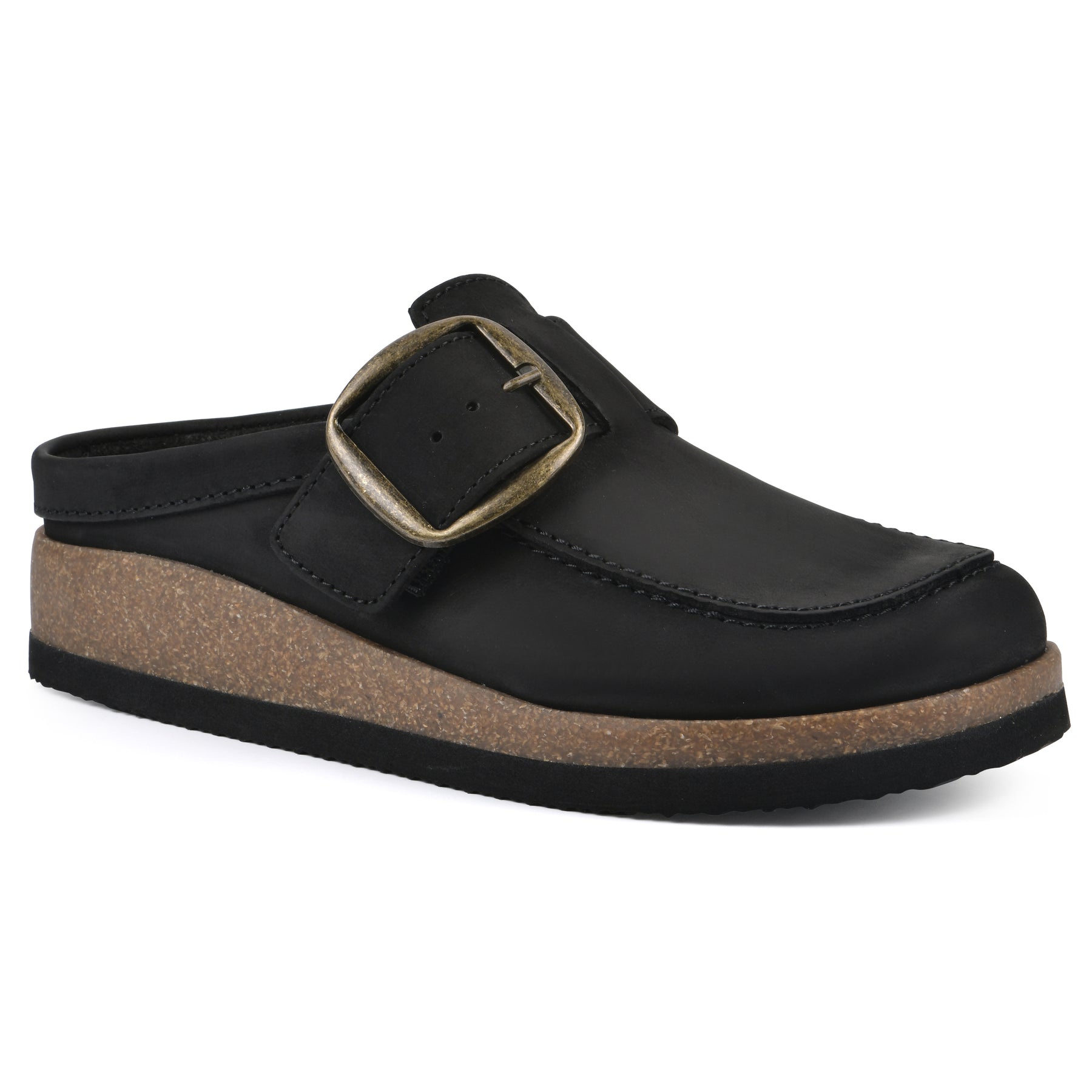 The Bueno by White Mountain Shoes is a classic moccasin-style clog that is right on trend. This clog has a contoured footbed to hug your foot and a soft cork bottom for maximum comfort. The oversized statement buckle makes this clog stand out. This shoe is perfect to throw on when it's chilly and is made out of genuine leather that lasts!