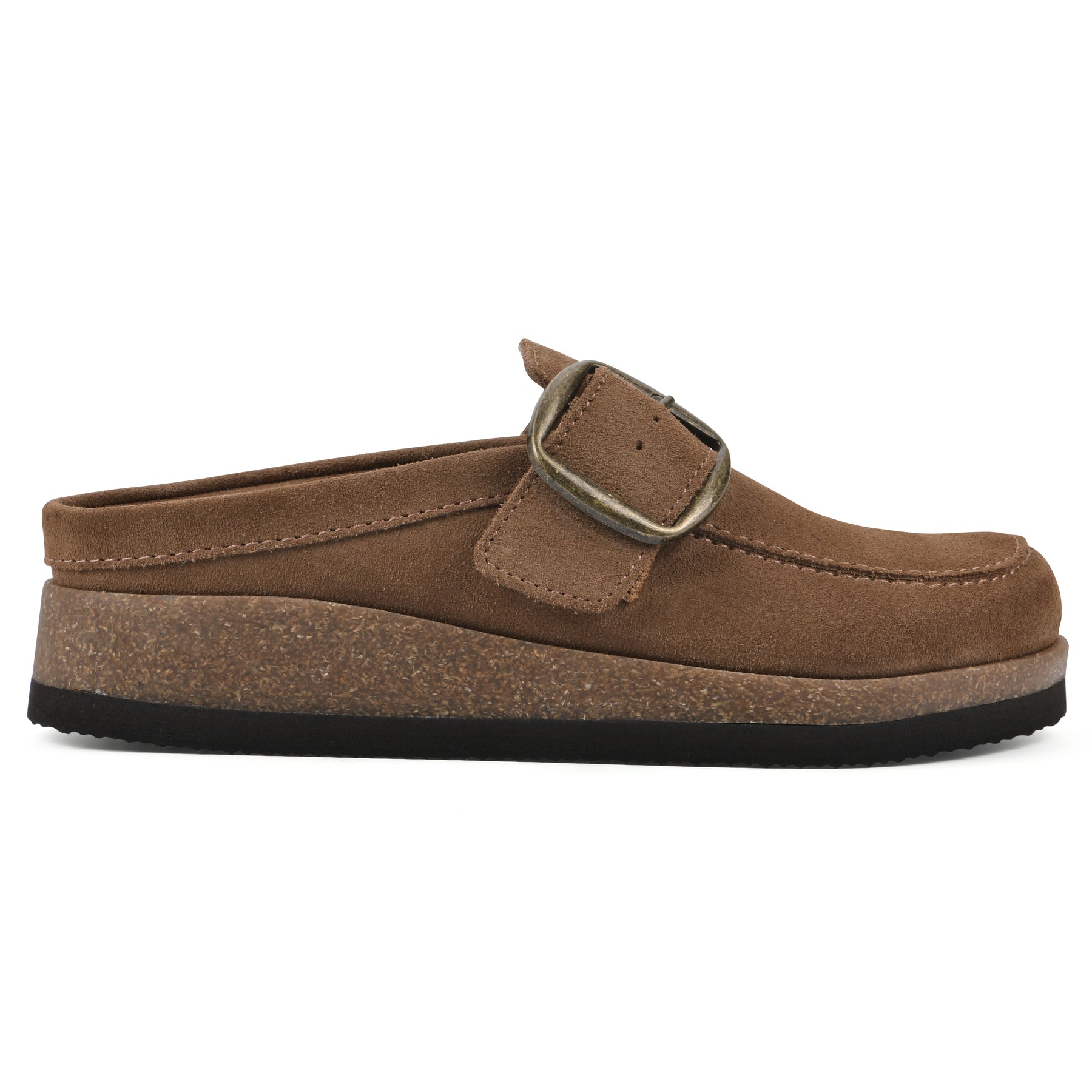 The Bueno by White Mountain Shoes is a classic moccasin-style clog that is right on trend. This clog has a contoured footbed to hug your foot and a soft cork bottom for maximum comfort. The oversized statement buckle makes this clog stand out. This shoe is perfect to throw on when it's chilly and is made out of genuine leather that lasts!