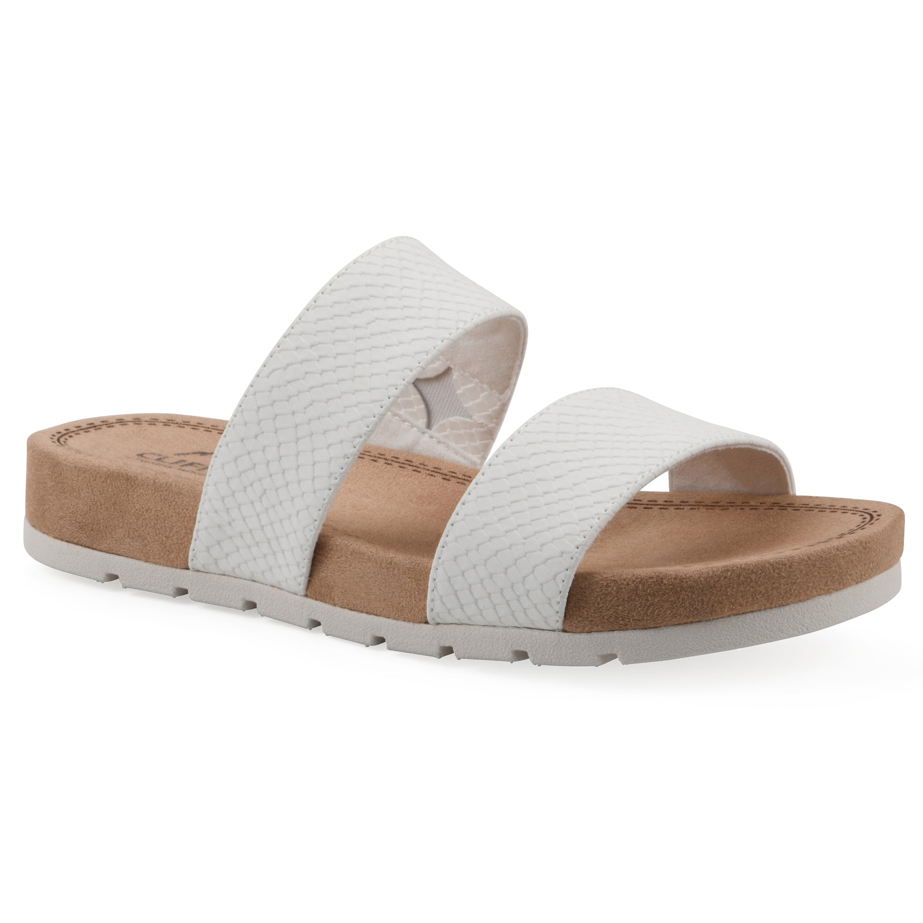 Get street-savvy in the textured double strap design of the chic Tahlie flat sandals from Cliffs by White Mountain Shoes. Slip into the soft suedette slightly padded insole of this easy slide.